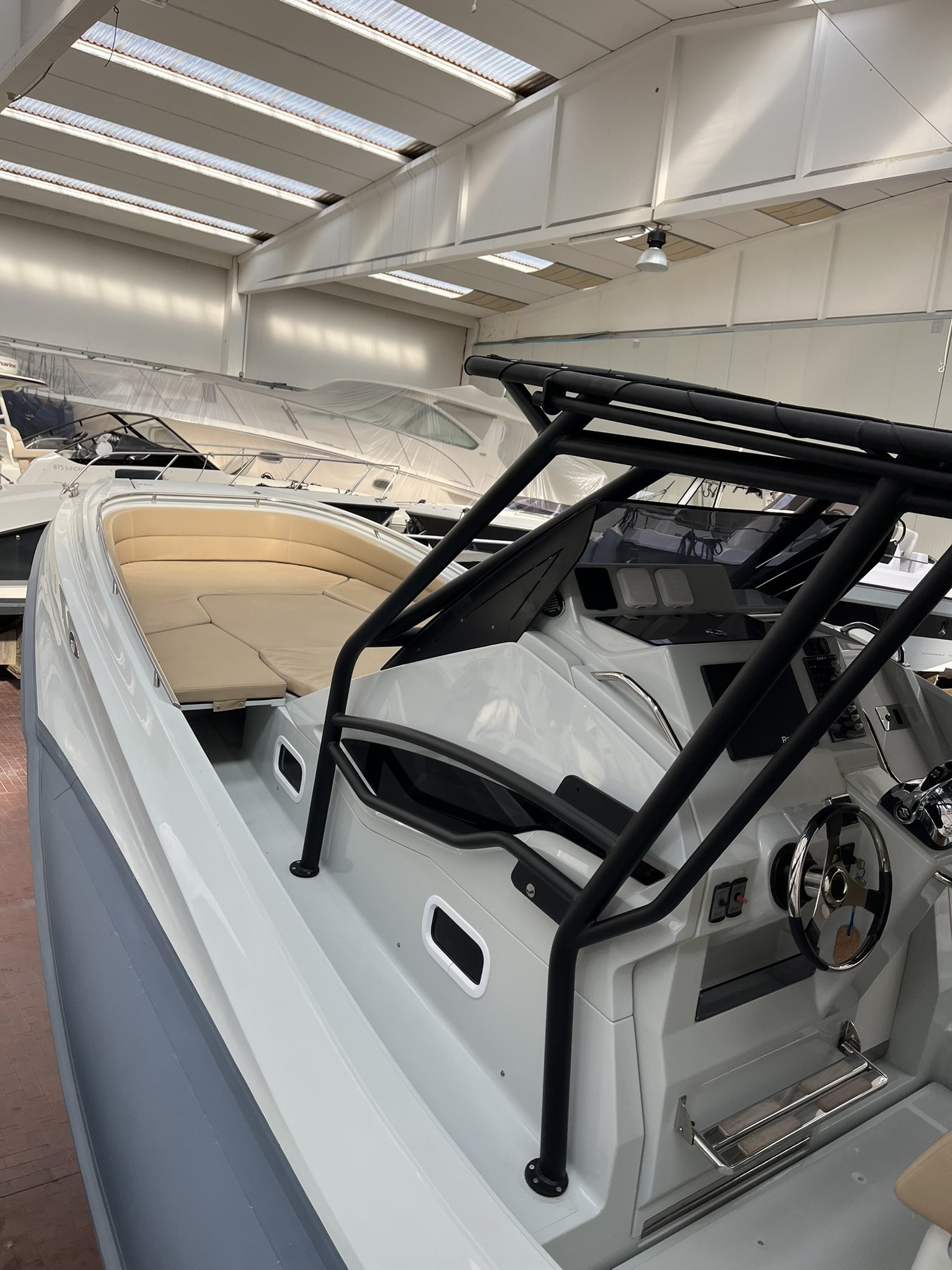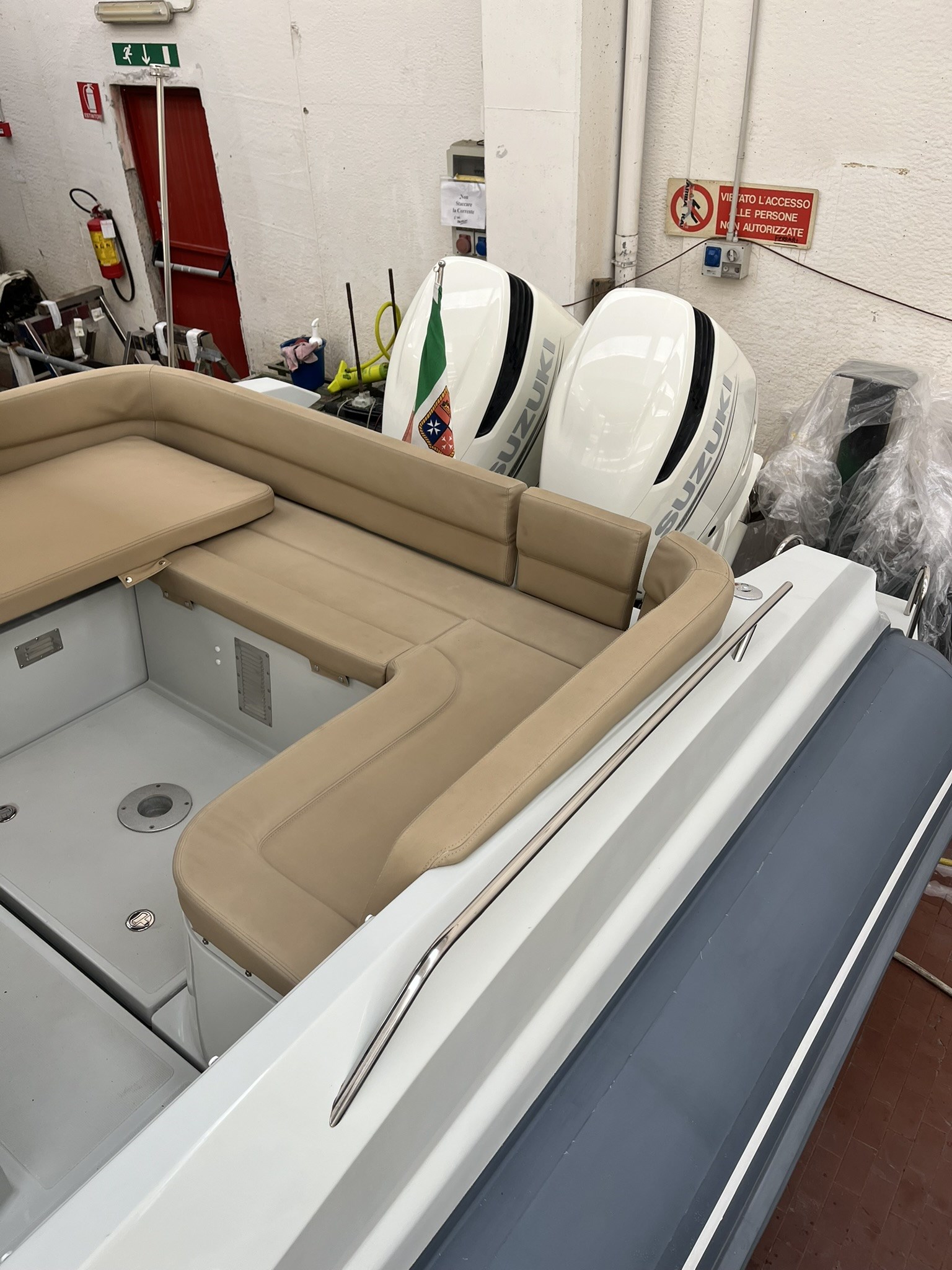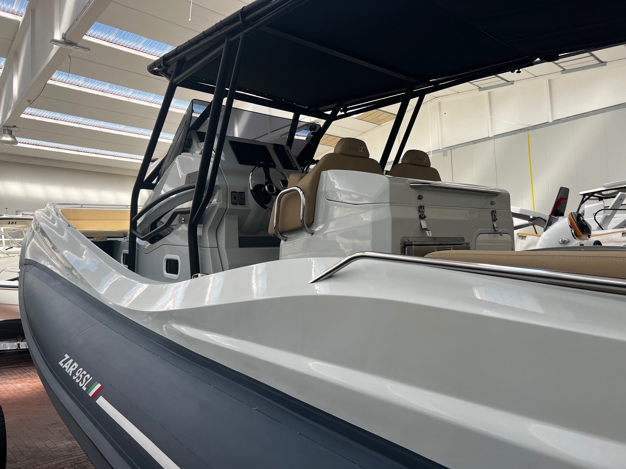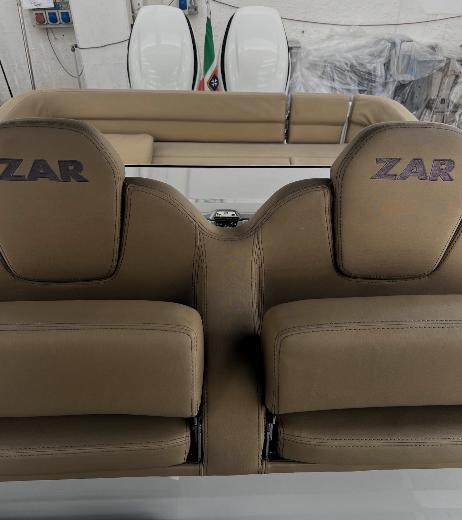 Zar 95 Sport Luxury with 2 x 300hp Suzukis Cabin with double bed, separate bathroom with electric marine toilet and black water, sink and shower; aft and bow sofa where there are two large sunbathing areas that can be converted into as many dinettes; deep-V hull, equipped with side redans to guarantee performance, stability and softness when sailing. Well equipped with new Custom rigid T.Top, double extendable sun awning, complete electronics, 220 V circuit, electric winch, refrigerator and galley, extended aft platforms, complete cushions. Complete polishing of fiberglass and tubular parts, T Top satin black stainless steel new 2025 Absolutely excellent condition