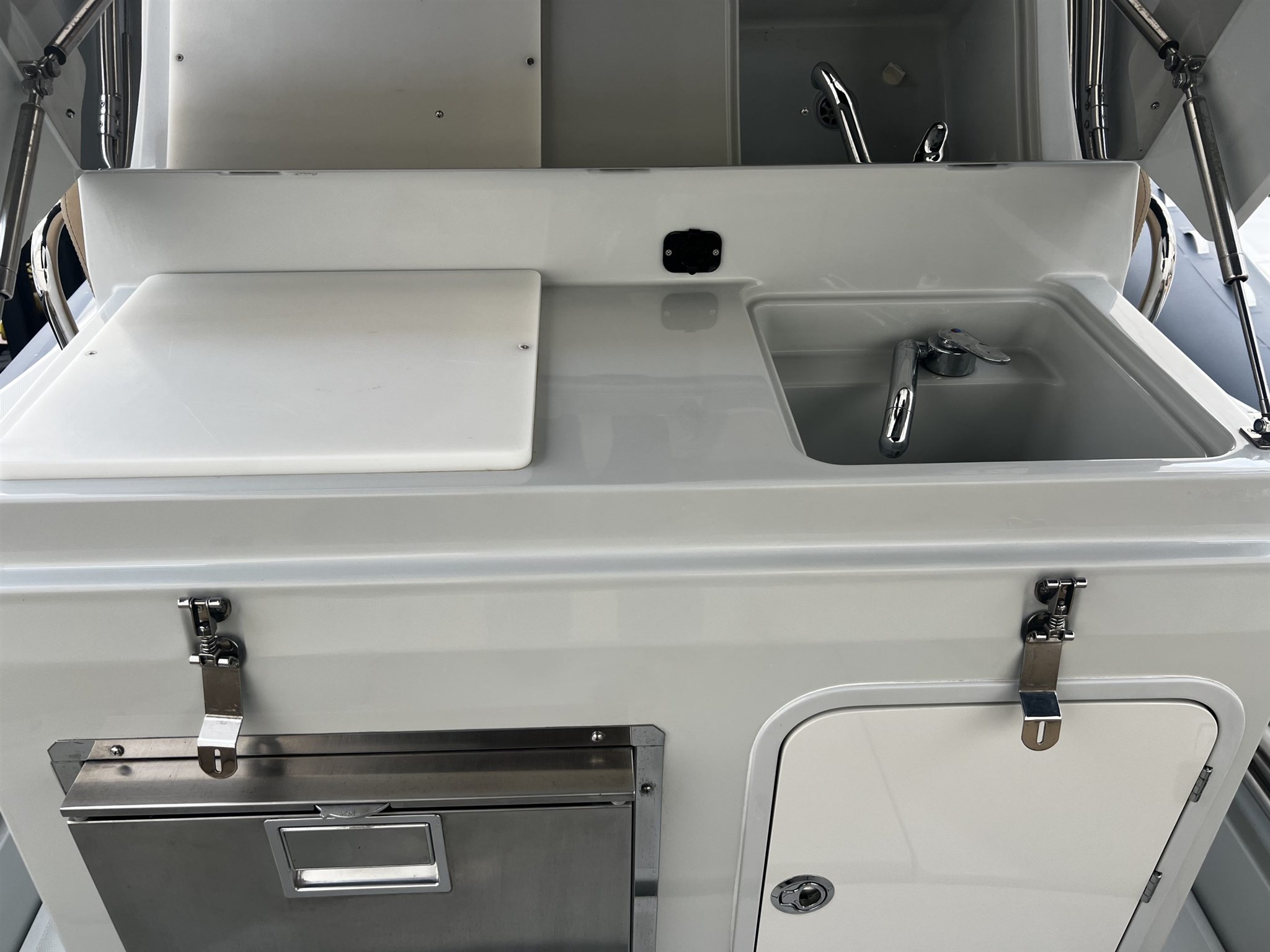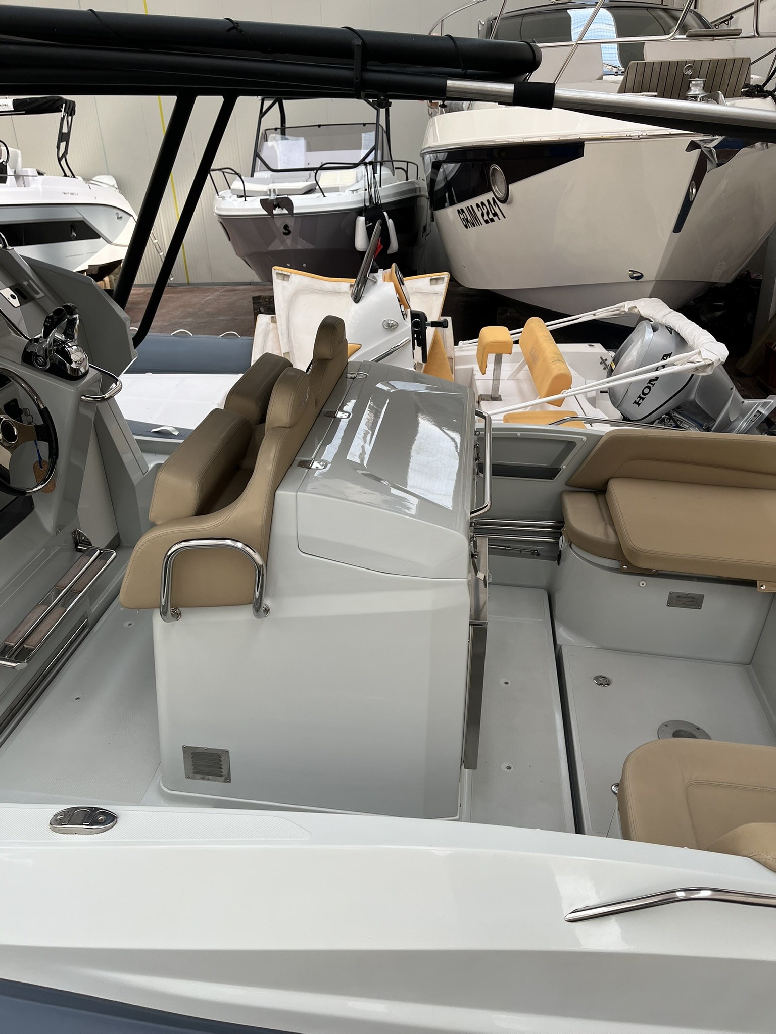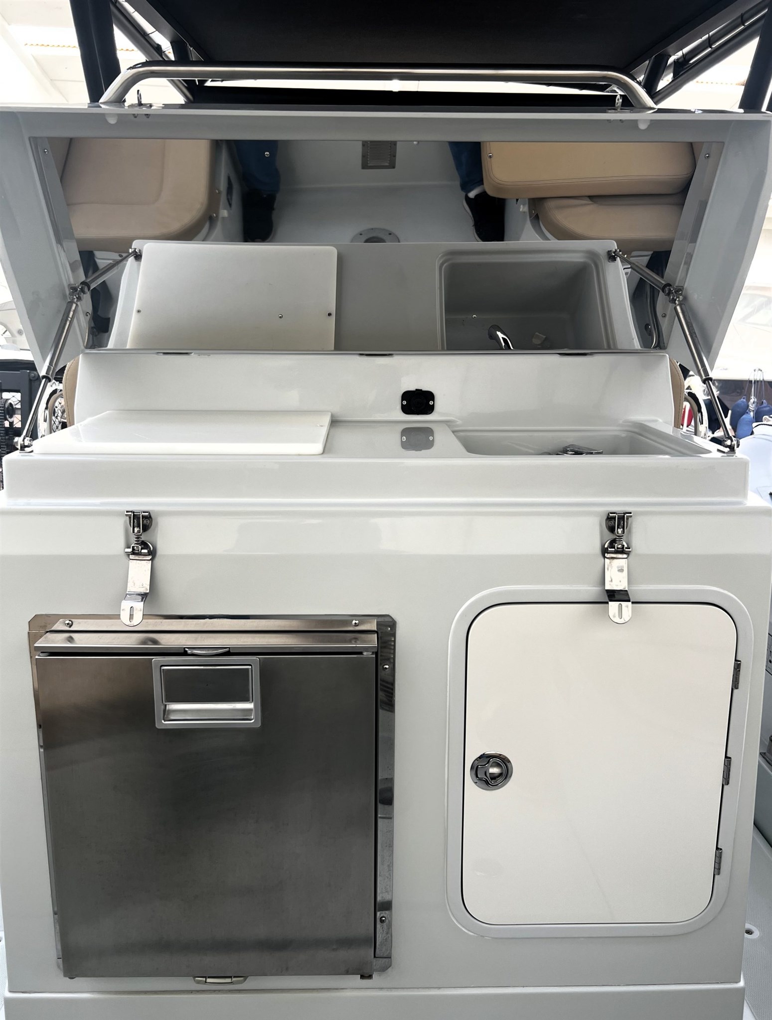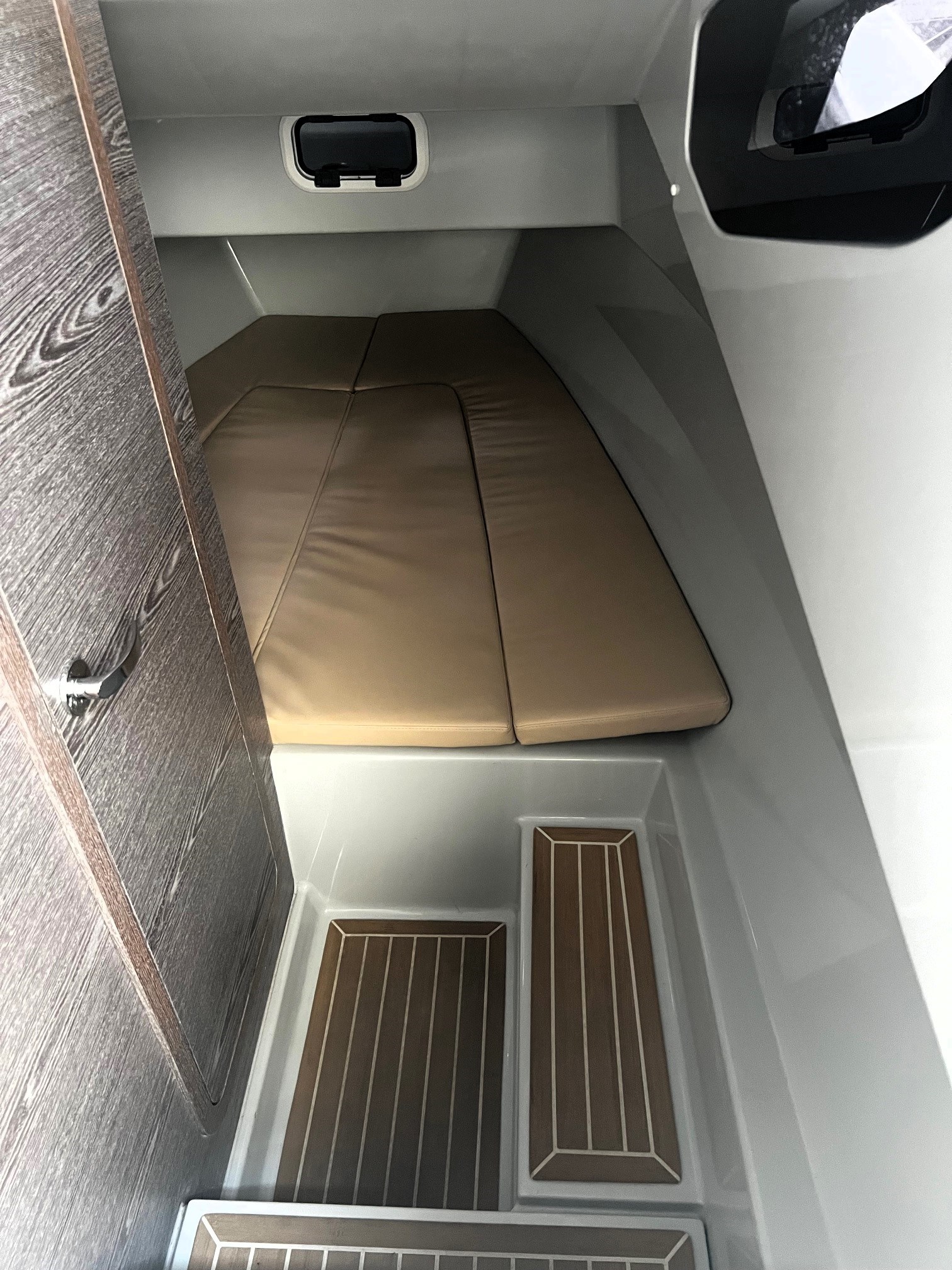 Zar 95 Sport Luxury with 2 x 300hp Suzukis Cabin with double bed, separate bathroom with electric marine toilet and black water, sink and shower; aft and bow sofa where there are two large sunbathing areas that can be converted into as many dinettes; deep-V hull, equipped with side redans to guarantee performance, stability and softness when sailing. Well equipped with new Custom rigid T.Top, double extendable sun awning, complete electronics, 220 V circuit, electric winch, refrigerator and galley, extended aft platforms, complete cushions. Complete polishing of fiberglass and tubular parts, T Top satin black stainless steel new 2025 Absolutely excellent condition