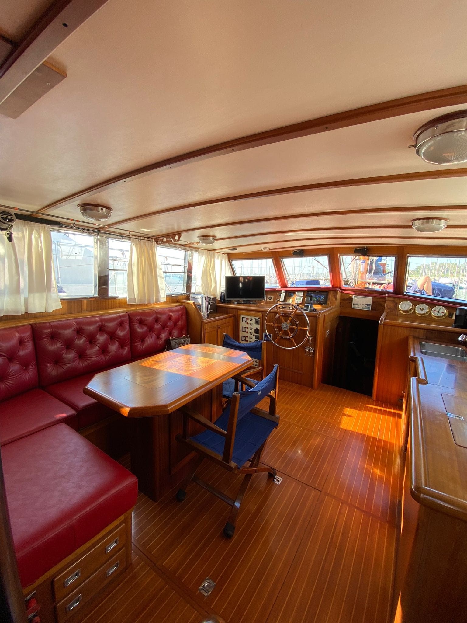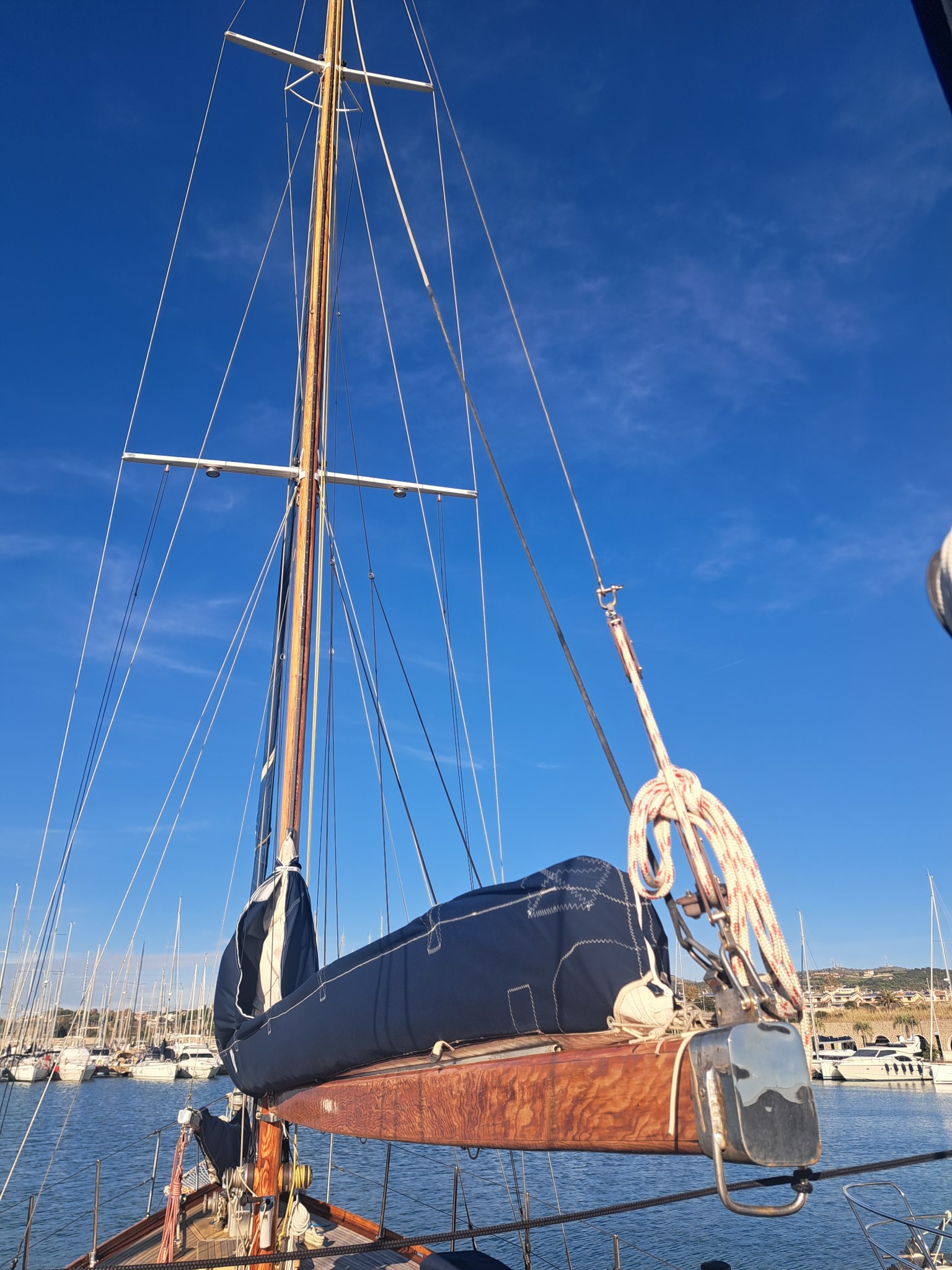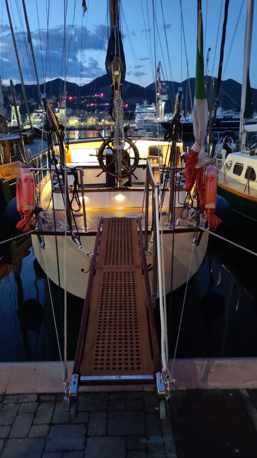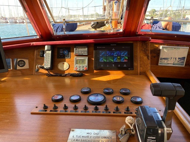 Shipyard: CIRO MASSA (Torre del Greco) Type:Motorsailer, Custom wooden ketch , Year:1974, Engine make:Caterpillar D9304T, hp 169 Engine hours: 2.179 Imp. electric12/24/220 volt Revision:2025 Generator:3,5 KW INVERTER: Mastervolt combi 3,5 kw new 2025 INVERTER Mastervolt 1,5 kw 2023 Strum Wind : Wind Station Raymarine new 2025 GPS: Raymarine Charter Plotter: Interior Raymarine Axiom 12 - 2020 External Axiom 9 - 2024 VHF : Shipmate RS8300 Autopilot: Autohelm ST6000+ Windlass : Lofrans Titan complete with remote control and meter counter (2024 changed engine, shaft and bearings) Radar: yes Heating: yes Depth sounder: yes, Real vision 3D Raymarine Air Conditioning: yes, new 2025. Bow thruster: yes electric with reserved battery 2025 Chargers: Services 100 A 2025, engine 25 A 2023, bow thruster 25 A 2020, generator set 10 A 2020 Interior layout and features : Deck saloon, Flat double aft cabin with en-suite bathroom, L-shaped double central cabin with external bathroom, Full beam forward cabin, with 1 double bed and two single beds with en-suite bathroom, Forward sailor cabin with marine toilet, sink and hand shower, with separate indoor and outdoor access., Engine room under deck saloon, with access from the aft cabin and from the saloon floor., Other accessories : AIS Raymarine 700 transponder, Epirb 2024, Load monitoring system, electrical and service battery charge reserve, Automatic and manual engine room fire extinguishing system, Mastervolt battery charger, Mastervolt inverter, Double circuit, engine batteries (180°) / services (400°) with double alternator Tender keel rigid keel in Quicksilver aluminum 3.20 m, rigid bench with fuel tank and engine starter battery with quick coupling, Mercury 4 t 15 HP engine with electric ignition, (year 2020). Two ocean rafts 8 seats each Eurovinil (2019) Complete life jackets for 16 people MOB system Standard safety equipment, lifeline Gangway with mahogany spars and teak trob LED mast lights Deck lights on led spreaders Navigation lights Step lights on led cockpit Brass led lumishore underwater lights with control unit and scenarios Complete sunbathing cushions on deckhouse deck saloon Cockpit cushions Kitchen machine (3 burners and oven) with gas replaced in 2023 3 outdoor fresh water shower points 1 outdoor salt water shower point Stern davits for tender Tender engine support on deck Ladder for descent to the sea, with the possibility of mounting on both sides Digital antenna for Samsung TV Textile covers for deck equipment Winter canopy Summer awning Sails and Rigging :Rigging and turnbuckles all new 2025 Genoa on forestay new 2025 bombress master, with quickdraws in the cockpit and furling jib Boomed staysail (douglas boom) self-tacking mainsail with mast and wooden boom (douglas). Lazy jack (2025) and lazy bag (2020) Mizzen mainsail with mast and wooden boom (douglas). Lazy jack (2025) and lazy bag (2020) Wood of the laminated dougls trees landed and maintained 2025 Electrical system of the trees completely redone 2025 Rigging, 8 mm, in braided steel new 2025 Moroccan structural steel new 2025 New tensioners 2025 Spreaders and mainmast hardware redone in 2025 Mizzen mast spreaders and hardware redone in 2025 New sheets and halyards 2025 New bakelite blocks 2025